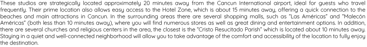 These studios are strategically located approximately 20 minutes away from the Cancun International airport, ideal for guests who travel frequently. Their prime location also allows easy access to the Hotel Zone, which is about 15 minutes away, offering a quick connection to the beaches and main attractions in Cancun. In the surrounding areas there are several shopping malls, such as “Las Américas” and “Malecón Américas” (both less than 10 minutes away), where you will find numerous stores as well as great dining and entertainment options. In addition, there are several churches and religious centers in the area, the closest is the “Cristo Resucitado Parish” which is located about 10 minutes away. Staying in a quiet and well-connected neighborhood will allow you to take advantage of the comfort and accessibility of the location to fully enjoy the destination.