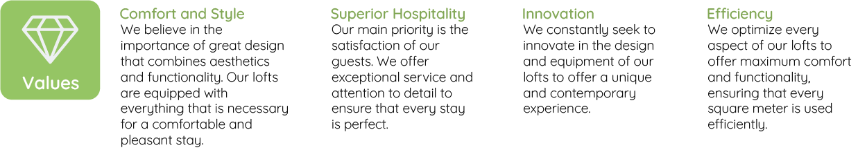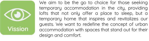 We aim to be the go to choice for those seeking temporary accommodation in the city, providing lofts that not only offer a place to sleep, but a temporary home that inspires and revitalizes our guests. We want to redefine the concept of urban accommodation with spaces that stand out for their design and comfort.